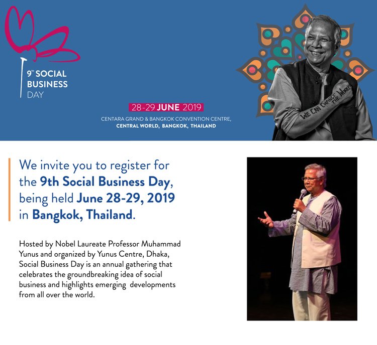 We are delighted to announce that the 9th Social Business Day, hosted by Nobel Laureate Professor Muhammad Yunus, will be held on June 28-29, 2019 in Bangkok, Thailand organized by Yunus Centre, Dhaka, Asian Institute of Technology (AIT), Thailand and Kasetsart University, Thailand.