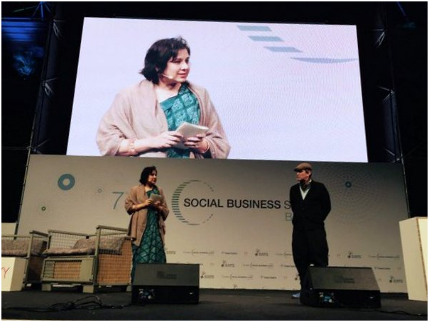 ছবি-২ঃ ৪ নভেম্বর ২০১৫ তারিখে জার্মানীর বার্লিনে শুরু ৭ম বিশ্ব সামাজিক ব্যবসা শীর্ষ সম্মেলনের উদ্বোধনী অনুষ্ঠানে সভামঞ্চে ইউনূস সেন্টারের প্রধান নির্বাহী লামিয়া মোর্শেদ ও গ্রামীণ ক্রিয়েটিভ ল্যাব জার্মানীর হ্যান্স রীজ।