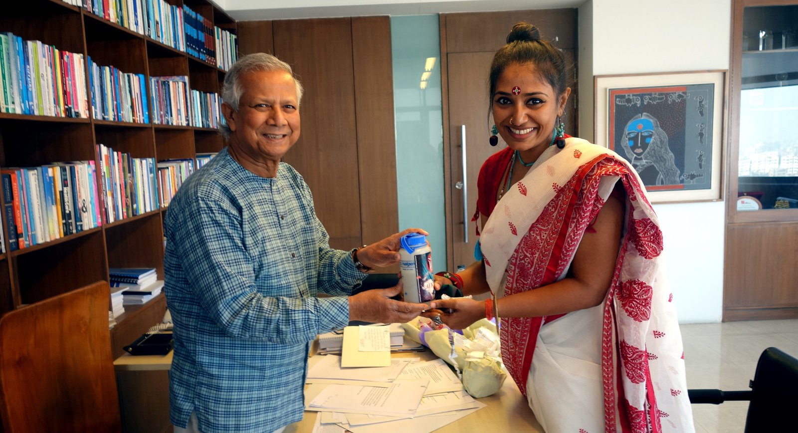 Nobel Laureate Professor Muhammad Yunus accorded a reception to Wasfia Nazreen on Thursday at Yunus Centre to celebrate Wasfia having successfully completed her campaign to climb the seven highest summits on the seven continents. Wasfia presented to Nobel Nobel Laureate Professor Muhammad Yunus water from snow taken from Mt Everest as well as flag that she had carried with her to all seven summits. Yunus Centre also facilitated interactions between Wasfia, and young students from different universities of home and abroad, and the staff of Yunus Centre who engaged her into a question and answer session after she shared the exciting stories of her adventures with them.