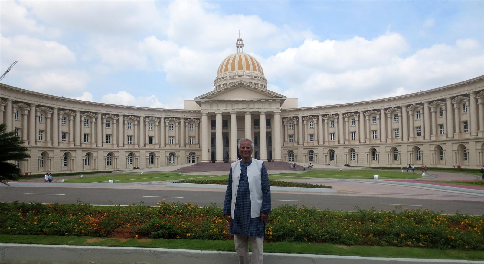 ইনফোসিস গেøাবাল ডেভেলপমেন্ট সেন্টারের মাইশোর প্রশিক্ষণ কেন্দ্রের মূল ভবনের সামনে দাঁড়িয়ে নোবেল লরিয়েট অধ্যাপক মুহাম্মদ ইউনূস। অধ্যাপক ইউনূস ইনফোসিসের আমন্ত্রণে কেন্দ্রটি পরিদর্শনে যান।