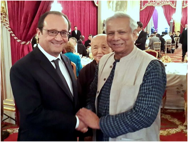 ইউনূস সেন্টার প্রেস রিলিজ (২০ জুলাই ২০১৫)ফ্রান্সের প্রেসিডেন্ট ফ্রাঁসোয়া ওলাঁদ ২০ জুলাই তারিখে এলিসি প্রাসাদে “সামিট অব কনশন্স ফর দ্য ক্লাইমেট” অনুষ্ঠানের গুরুত্বপূর্ণ বক্তাদের সম্মানে আয়োজিত নৈশভোজে নোবেল শান্তি পুরষ্কার জয়ী প্রফেসর মুহাম্মদ ইউনূসকে অভ্যর্থনা জানান। এ বছর নভেম্বর ৩০ থেকে ডিসেম্বর ১১ পর্যন্ত প্যারিসে অনুষ্ঠেয় জলবাযু পরিবর্তন বিষয়ক জাতিসংঘ ফ্রেমওয়ার্ক কনভেনশনের ৫ মাস পূর্বে “সামিট অব কনশন্স ফর দ্য ক্লাইমেট” অনুষ্ঠিত হয়। সামিটে প্রফেসর মুহাম্মদ ইউনূস তাঁর “হোয়াই ডু আই কেয়ার” শীর্ষক বক্তব্যে তাঁর মতামত তুলে ধরেন। “হোয়াই ডু আই কেয়ার” এই সামিটের শ্লোগান যা বৈশ্বিক তাপমাত্রা বৃদ্ধির মূল কারন জীবাশ্ম জ্বালানীর ব্যবহার কমিয়ে আনতে প্রতিটি ব্যক্তিকে উৎসাহিত করে। শ্রোতাদের মধ্যে ছিলেন জলবায়ু ও পরিবেশ বিষয়ক ৫০০ জন বিশেষজ্ঞ, অংশগ্রহণকারী দেশগুলোর রাষ্ট্রদূতগণ, বিভিন্ন মতাদর্শে বিশ্বাসী ও ধর্মনিরপেক্ষ কমিউনিটিগুলোর প্রভাবশালী প্রতিনিধিগণ এবং যুব প্রতিনিধিরা।