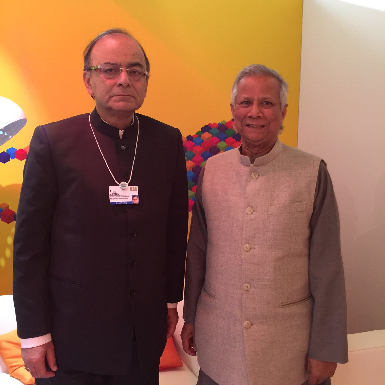 Nobel Laureate Professor Muhammad Yunus had a meeting with Union Finance Minister of India Arun Jaitley at his invitation to discuss programs for the poor in India on 21 January in Davos during the World Economic Forum.