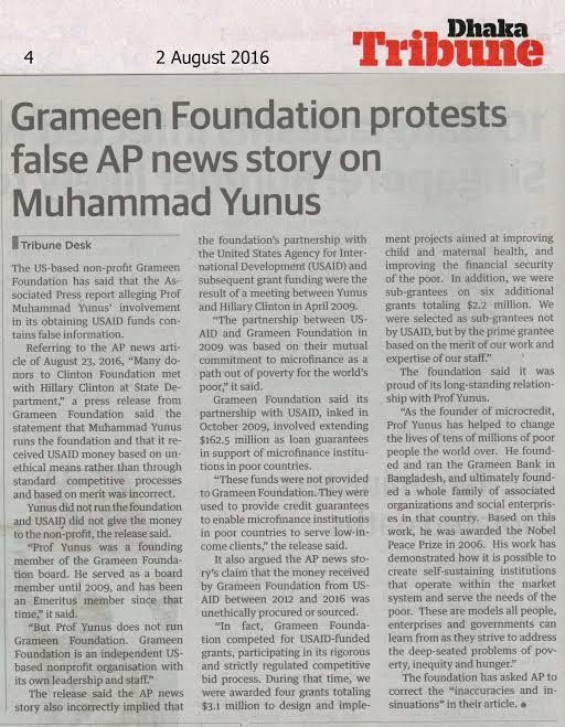 Referring to the AP news article of August 23, 2016, “Many donors to Clinton Foundation met with Hillary Clinton at State Department,” a press release from Grameen Foundation said the statement that Muhammad Yunus runs the foundation and that it received USAID money based on unethical means rather than through standard competitive processes and based on merit was incorrect.