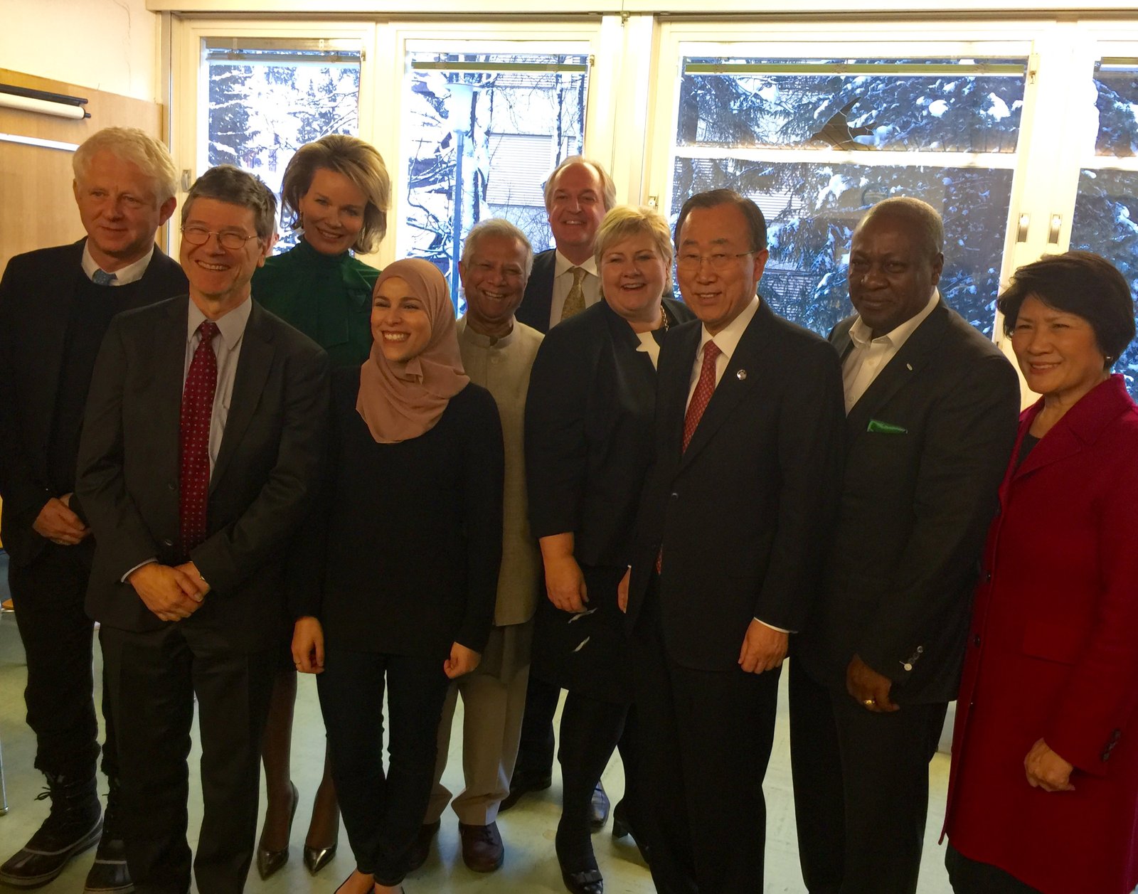 Photo Caption: The members of the just announced UN SDG Advocates Group with UN Secretary General Ban Ki Moon in Davos on January 21. From left to right, British filmmaker and activist Richard Curtis, Professor Jeffrey Sachs, HM Queen Mathilde of Belgium, Libyan activist Alaa Murabit, Professor Muhammad Yunus, Unilever CEO Paul Polman, Prime Minister Erna Solberg of Norway, UN Secretary General Ban Ki Moon, President Mahama of Ghana, Ambassador Dho from South Korea