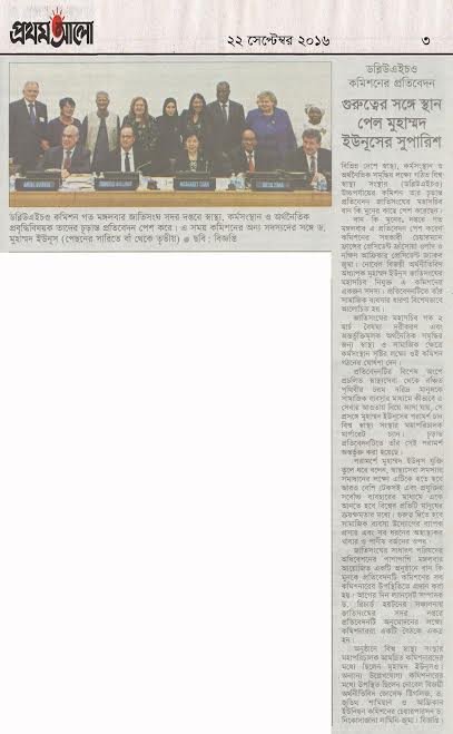 প্রতিবেদনটির বিশেষ অংশে প্রচলিত স্বাস্থ্যসেবা থেকে বঞ্চিত পৃথিবীর চরম দরিদ্র মানুষকে সামাজিক ব্যবসার মাধ্যমে কীভাবে এ সেবার আওতায় নিয়ে আসা যায়, সে প্রসঙ্গে মুহাম্মদ ইউনূসের পরামর্শ চান বিশ্ব স্বাস্থ্য সংস্থার মহাপরিচালক মার্গারেট চ্যান। চূড়ান্ত প্রতিবেদনটিতে তাঁর সেই পরামর্শ অন্তর্ভুক্ত করা হয়েছে।