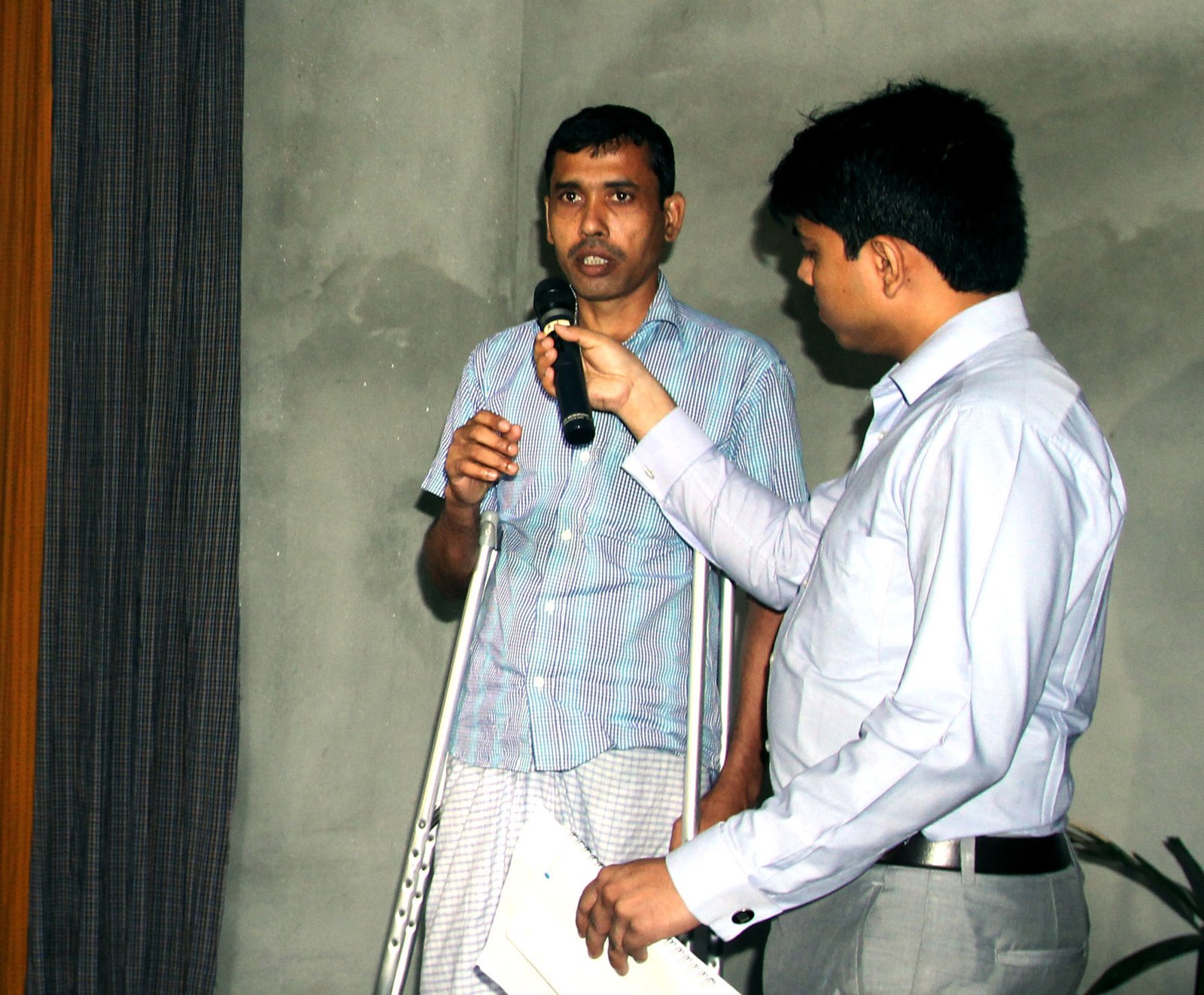 ছবির ক্যাপশন-৪: শারীরিক প্রতিবন্ধী নবীন উদ্যোক্তা “আমজাদ জামদানী হাউস”-এর মোঃ আমজাদ ১৮ এপ্রিল ২০১৬ সোমবার অনুষ্ঠিত ২২৯শ সামাজিক ব্যবসা ডিজাইন ল্যাবে উপস্থিত দর্শকদের নিকট তাঁর ব্যবসা পরিকল্পনা উপস্থাপন করছেন।