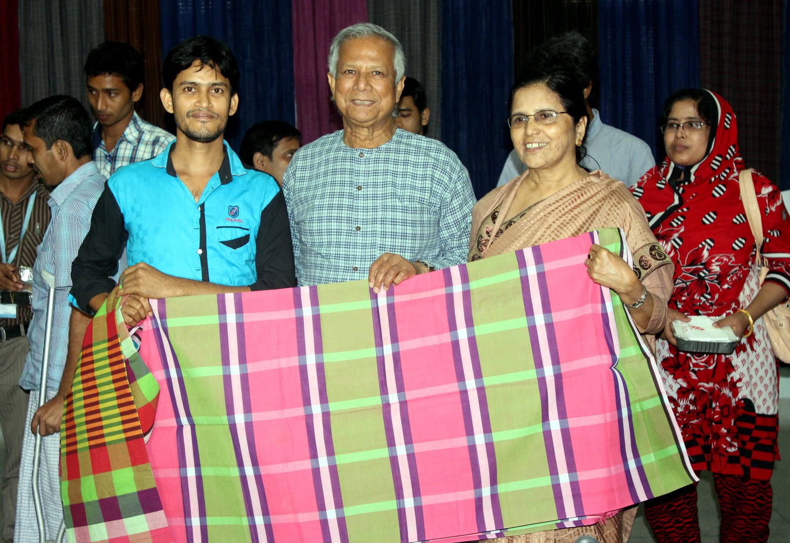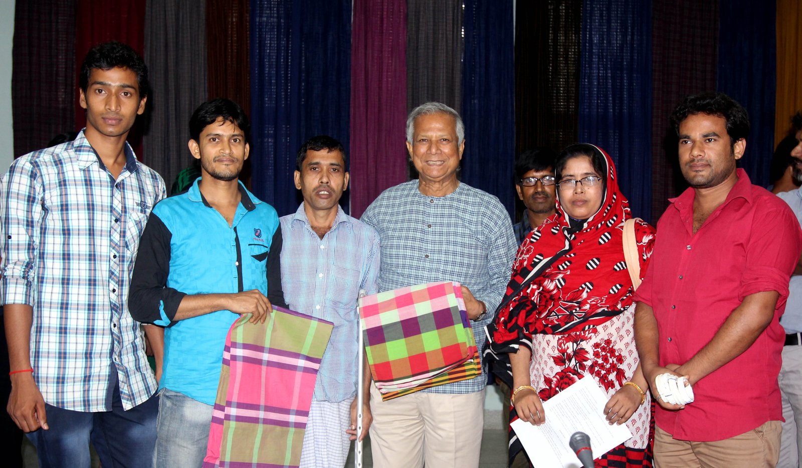 ছবির ক্যাপশন-১: ১৮ এপ্রিল ২০১৬ তারিখ সোমবার অনুষ্ঠিত ২২৯শ সামাজিক ব্যবসা ডিজাইন ল্যাবে ৬টি সামাজিক ব্যবসায়ে বিনিয়োগের ঘোষণা দেয়া হয়। গ্রামীণ ব্যাংক সদস্য পরিবারের সন্তান নবীন উদ্যোক্তাদের ছবিতে নোবেল লরিয়েট প্রফেসর মুহাম্মদ ইউনূসের সাথে দেখা যাচ্ছে। ছবিতে নবীন উদ্যোক্তা মিজানুর তাঁর তাঁতে তৈরী রঙীণ লুঙ্গি প্রদর্শণ করছেন।