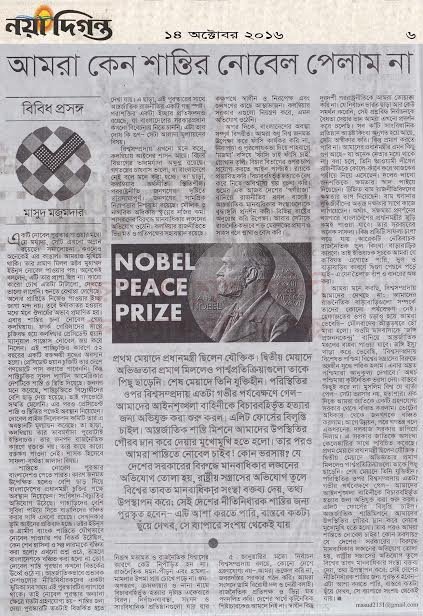 শান্তিতে নোবেল পুরস্কার বাংলাদেশও পেতে পারত। কারণ জনমত উপেক্ষিত হলেও বেশি ছাড় দিয়ে বাংলাদেশের প্রধানমন্ত্রী চুক্তির পক্ষে অবস্থান নিয়েছেন। সংবিধান-বিচ্যুতির অভিযোগ উঠেছে। পাহাড়িদের বেশি সুবিধা পাইয়ে দিতে বাঙালিদের বঞ্চিত করার দাবি এখনো রয়েছে। সেখানকার ভূমি আইনের প্রতিবাদ হচ্ছে। ডক্টর ইউনূস ও গ্রামীণ ব্যাংক শান্তিতে যৌথভাবে নোবেল পাওয়ার পর বিতর্ক উঠেছিল, কেন শেখ হাসিনা ও সন্তু লারমাকে বঞ্চিত করা হলো? এখনো প্রশ্ন ওঠে, তাহলে বাংলাদেশকে বঞ্চিত করা হলো না তো! নোবেল শান্তি পুরস্কার কখনো বিতর্কের ঊর্ধ্বে ওঠে না। আন্তর্জাতিকভাবে প্রভাবক দেশগুলোর নীতিনির্ধারকদের একটা ভূমিকা সব সময় এই পুরস্কারটির ব্যাপারে থাকে। তাই নোবেল পুরস্কার অন্যান্য ক্ষেত্রে যতটা গ্রহণযোগ্য হয়- শান্তির জন্য দেয়া পুরস্কারটি ততটাই বিতর্কিত হতে দেখা যায়। এ ছাড়া, এই পুরস্কারের সাথে আন্তর্জাতিক রাজনীতির একটি গন্ধ স্পষ্ট। পরাশক্তির একটা ইচ্ছার প্রতিফলনও রয়েছে, যা বাংলাদেশের সরকারপ্রধান কখনো বিবেচনায় নিতে চাননি। এটা তার দোষ কি গুণ- সেটা আলাদা মূল্যায়নের বিষয়।