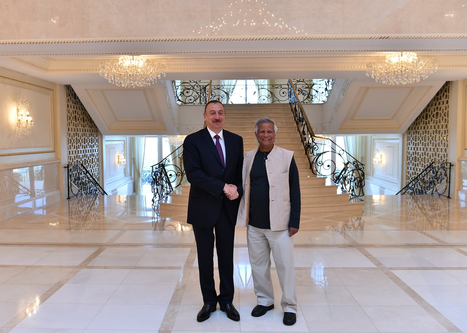 আজারবাইজান প্রজাতন্ত্রের প্রেসিডেন্ট ইলহাম আলিয়েভ ১৮ জুন ২০১৬ শনিবার শান্তিতে নোবেল জয়ী প্রফেসর মুহাম্মদ ইউনূসকে প্রেসিডেন্ট প্রাসাদে অভ্যর্থনা জানান। প্রফেসর ইউনূস ঐ দিনই তাঁর তিন দিনের আজারবাইজান সফরে সে দেশে পৌঁছান। প্রফেসর ইউনূস বিশ্বব্যাপী সামাজিক ব্যবসার সাম্প্রতিক অগ্রগতি বিষয়ে প্রেসিডেন্টকে অবহিত করেন। প্রেসিডেন্ট আলিয়েভ দারিদ্র বিমোচনে প্রফেসর ইউনূসের অবদানের প্রশংসা করেন এবং তাঁর দেশের উন্নয়নে সামাজিক ব্যবসা কী ভূমিকা পালন করতে পারে সে বিষয়ে প্রফেসর ইউনূসের সাথে সুনির্দিষ্টভাবে আলোচনা করেন।