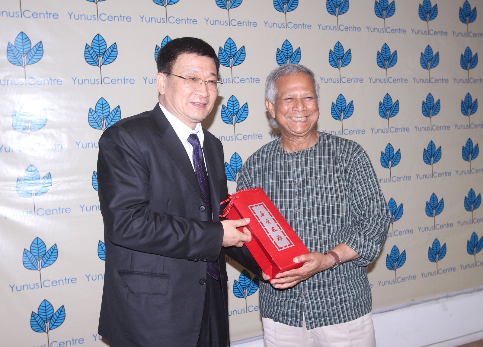 ছবির ক্যাপশন-১: চায়না ব্যাংকিং রেগুলেটরী কমিশনের (সিবিআরসি) ভাইস চেয়ারম্যান জনাব লিজেন গুয়োর সাথে নোবেল লরিয়েট প্রফেসর মুুহাম্মদ ইউনূস।