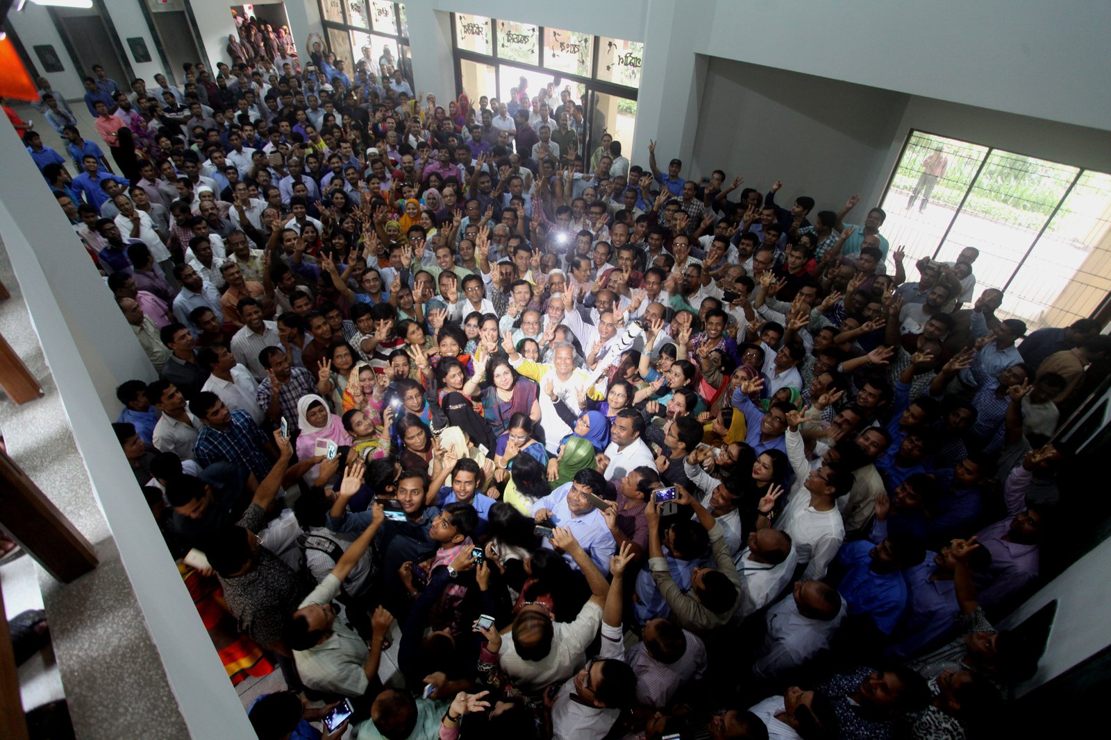 নোবেল লরিয়েট প্রফেসর মুহাম্মদ ইউনূস ঢাকায় ফিরেছেন। তাঁর সহকর্মীরা তুমুল হর্ষধ্বনির সাথে তাঁকে স্বাগত  জানিয়েছেন।