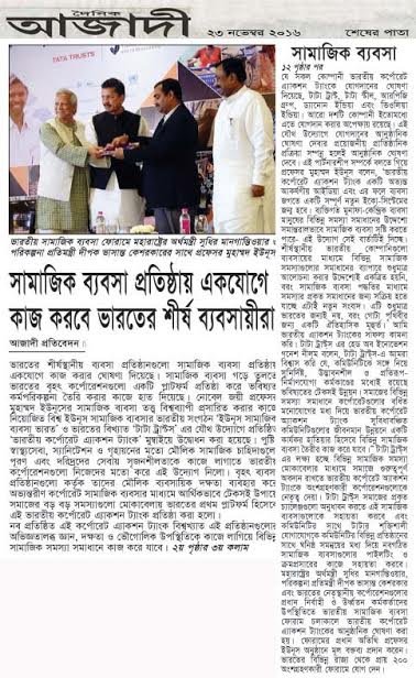 ভারতের শীর্ষস্থানীয় ব্যবসা প্রতিষ্ঠানগুলো সামাজিক ব্যবসা প্রতিষ্ঠায় একযোগে কাজ করার ঘোষণা দিয়েছে। সামাজিক ব্যবসা গড়ে তুলতে ভারতের বৃহৎ কর্পোরেশনগুলো একটি প্লাটফর্ম প্রতিষ্ঠা করে ভবিষ্যত কর্মপরিকল্পনা তৈরি করার কাজে হাত দিয়েছে। নোবেল জয়ী প্রফেসর মুহাম্মদ ইউনূসের সামাজিক ব্যবসা তত্ত্ব বিশ্বব্যাপী প্রসারিত করার কাজে নিয়োজিত বিশ্ব ইউনূস সামাজিক ব্যবসার ভারতীয় সংগঠন ‘ইউনূস সামাজিক ব্যবসা ভারত’ ও ভারতের বিখ্যাত ‘টাটা ট্রাস্টস’ এর যৌথ উদ্যোগে প্রতিষ্ঠিত ‘ভারতীয় কর্পোরেট এ্যাকশন ট্যাংক’ মুম্বাইয়ে উদ্বোধন করা হয়েছে। পুষ্টি, স্বাস্থ্যসেবা,স্যানিটেশন ও গৃহায়নের মতো মৌলিক সামাজিক চাহিদাগুলো পূরণ এবং দরিদ্রদের সেবায় সৃজনশীলতাকে কাজে লাগাতে ভারতীয় কর্পোরেশনগুলো নিজেদের মতো করে এই উদ্যোগ নিলো। বৃহৎ ব্যবসা প্রতিষ্ঠানগুলো কর্তৃক তাদের মৌলিক ব্যবসায়িক দক্ষতা ব্যবহার করে অভ্যন্তরীণ কর্পোরেট সামাজিক ব্যবসার মাধ্যমে আর্থিকভাবে টেকসই উপায়ে সমাজের বড় বড় সমস্যাগুলো মোকাবেলায় ভারতের প্রথম প্লাটফর্ম হিসেবে এই ভারতীয় কর্পোরেট এ্যাকশন ট্যাংক প্রতিষ্ঠা করা হলো।