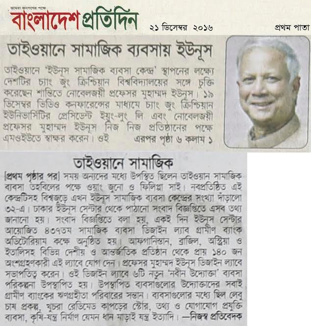তাইওয়ানে ‘ইউনূস সামাজিক ব্যবসা কেন্দ্র’ স্থাপনের লক্ষ্যে দেশটির চ্যাং জুং ক্রিশ্চিয়ান বিশ্ববিদ্যালয়ের সঙ্গে চুক্তি করেছেন শান্তিতে নোবেলজয়ী প্রফেসর মুহাম্মদ ইউনূস। ১৯ ডিসেম্বর ভিডিও কনফারেন্সের মাধ্যমে চ্যাং জুং ক্রিশ্চিয়ান ইউনিভার্সিটির প্রেসিডেন্ট ইয়ুং-লুং লি এবং নোবেলজয়ী প্রফেসর মুহাম্মদ ইউনূস নিজ নিজ প্রতিষ্ঠানের পক্ষে এমওইউতে স্বাক্ষর করেন। ওই সময় অন্যদের মধ্যে উপস্থিত ছিলেন তাইওয়ান সামাজিক ব্যবসা তহবিলের পক্ষে ওয়াং জুনো ও ফিলিপ্পা সাই। নবপ্রতিষ্ঠিত এই কেন্দ্রটিসহ বিশ্বজুড়ে এখন ইউনূস সামাজিক ব্যবসা কেন্দ্রের সংখ্যা দাঁড়ালো ৩২-এ। ঢাকার ইউনূস সেন্টার থেকে পাঠানো সংবাদ বিজ্ঞপ্তিতে এসব তথ্য জানানো হয়। সংবাদ বিজ্ঞপ্তিতে বলা হয়, একই দিন ইউনূস সেন্টার আয়োজিত ৪৩৭তম সামাজিক ব্যবসা ডিজাইন ল্যাব গ্রামীণ ব্যাংক অডিটোরিয়াম কক্ষে অনুষ্ঠিত হয়। আফগানিস্তান, ব্রাজিল, অস্ট্রিয়া ও ইতালিসহ বিভিন্ন দেশীয় ও আন্তর্জাতিক প্রতিষ্ঠান থেকে প্রায় ১৪০ জন অংশগ্রহণকারী এই ল্যাবে যোগ দেন। প্রফেসর মুহাম্মদ ইউনূস ডিজাইন ল্যাবে সভাপতিত্ব করেন। ওই ডিজাইন ল্যাবে ৬টি নতুন ‘নবীন উদ্যোক্তা’ ব্যবসা পরিকল্পনা উপস্থাপিত হয়। উপস্থাপিত ব্যবসাগুলোর উদ্যোক্তাদের সবাই গ্রামীণ ব্যাংকের ঋণগ্রহীতা পরিবারের সন্তান। ব্যবসাগুলোর মধ্যে ছিল লেবু চাষ প্রকল্প, খুচরা রেডিমেড কাপড়ের স্টোর, তথ্য ও যোগাযোগ প্রযুক্তি ব্যবসা, কৃষি-যন্ত্র নির্মাণ যেমন ধান মাড়াই যন্ত্র ইত্যাদি।