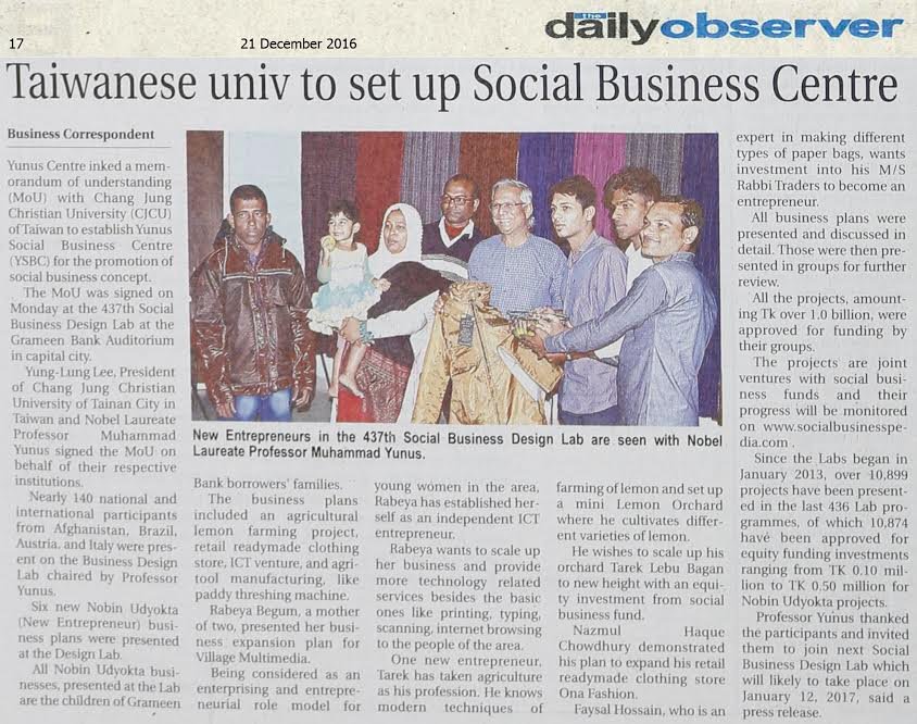 Yunus Centre inked a memorandum of understanding (MoU) with Chang Jung Christian University (CJCU) of Taiwan to establish Yunus Social Business Centre (YSBC) for the promotion of social business concept. The MoU was signed on Monday at the 437th Social Business Design Lab at the Grameen Bank Auditorium in capital city. Yung-Lung Lee, President of Chang Jung Christian University of Tainan City in Taiwan and Nobel Laureate Professor Muhammad Yunus signed the MoU on behalf of their respective institutions. Nearly 140 national and international participants from Afghanistan, Brazil, Austria, and Italy were present on the Business Design Lab chaired by Professor Yunus. Six new Nobin Udyokta (New Entrepreneur) business plans were presented at the Design Lab. All Nobin Udyokta businesses, presented at the Lab are the children of Grameen Bank borrowers' families. The business plans included an agricultural lemon farming project, retail readymade clothing store, ICT venture, and agri-tool manufacturing, like paddy threshing machine. Rabeya Begum, a mother of two, presented her business expansion plan for Village Multimedia. Being considered as an enterprising and entrepreneurial role model for young women in the area, Rabeya has established herself as an independent ICT entrepreneur. Rabeya wants to scale up her business and provide more technology related services besides the basic ones like printing, typing, scanning, internet browsing to the people of the area. One new entrepreneur, Tarek has taken agriculture as his profession. He knows modern techniques of farming of lemon and set up a mini Lemon Orchard where he cultivates different varieties of lemon. He wishes to scale up his orchard Tarek Lebu Bagan to new height with an equity investment from social business fund. Nazmul Haque Chowdhury demonstrated his plan to expand his retail readymade clothing store Ona Fashion. Faysal Hossain, who is an expert in making different types of paper bags, wants investment into his M/S Rabbi Traders to become an entrepreneur.