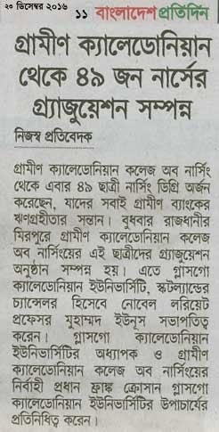 গ্রামীণ ক্যালেডোনিয়ান কলেজ অব নার্সিং থেকে এবার ৪৯ ছাত্রী নার্সিং ডিগ্রি অর্জন করেছেন, যাদের সবাই গ্রামীণ ব্যাংকের ঋণগ্রহীতার সন্তান। বুধবার রাজধানীর মিরপুরে গ্রামীণ ক্যালেডোনিয়ান কলেজ অব নার্সিংয়ের এই ছাত্রীদের গ্র্যাজুয়েশন অনুষ্ঠান সম্পন্ন হয়। এতে গ্লাসগো ক্যালেডোনিয়ান ইউনিভার্সিটি, স্কটল্যান্ডের চ্যান্সেলর হিসেবে নোবেল লরিয়েট প্রফেসর মুহাম্মদ ইউনূস সভাপতিত্ব করেন। গ্লাসগো ক্যালেডোনিয়ান ইউনিভার্সিটির অধ্যাপক ও গ্রামীণ ক্যালেডোনিয়ান কলেজ অব নার্সিংয়ের নির্বাহী প্রধান ফ্রাঙ্ক ক্রোসান গ্লাসগো ক্যালেডোনিয়ান ইউনিভার্সিটির উপাচার্যের প্রতিনিধিত্ব করেন। গতকাল রাজধানীর ইউনূস সেন্টার এক সংবাদ বিজ্ঞপ্তিতে এ তথ্য জানায়।