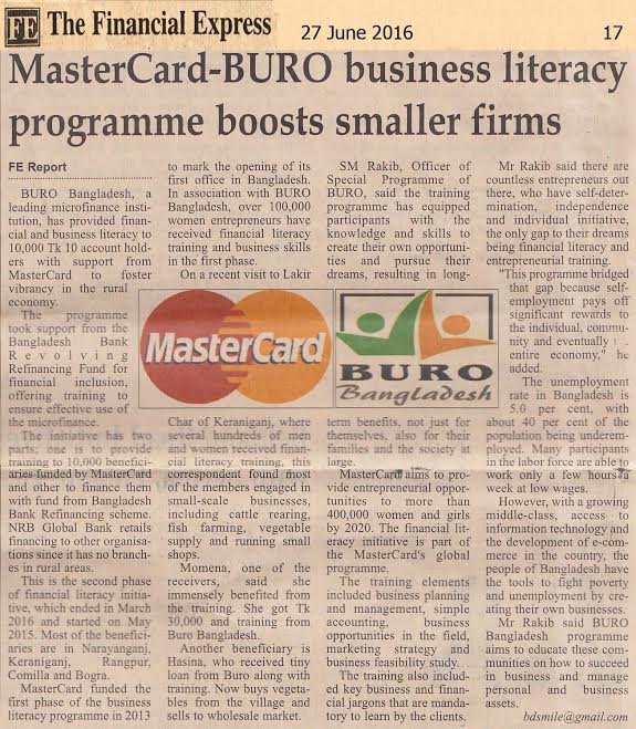 MasterCard funded the first phase of the business literacy programme in 2013 to mark the opening of its first office in Bangladesh. In association with BURO Bangladesh, over 100,000 women entrepreneurs have received financial literacy training and business skills in the first phase.