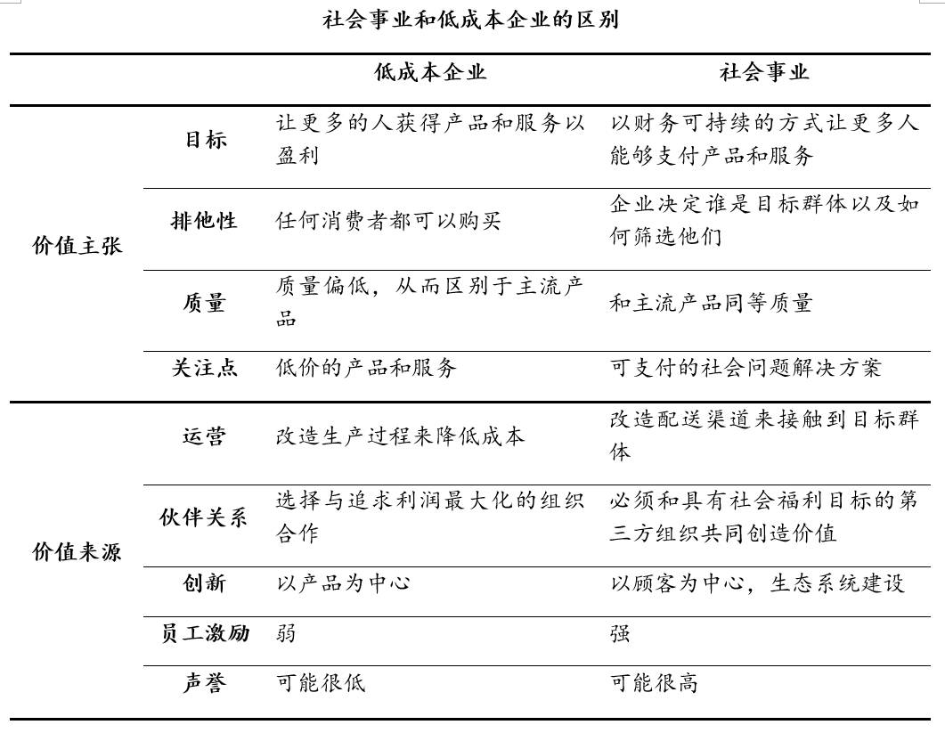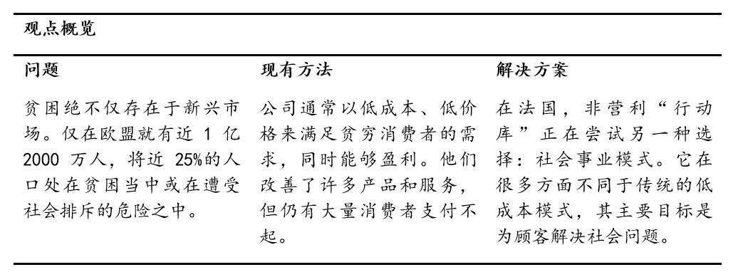 作者: 穆罕默德·尤努斯,格莱珉银行创始人,2006年诺贝尔和平奖获得者 Frédéric Dalsace,巴黎高等商学院市场营销学副教授 David Menascé,社会事业咨询公司Azao总经理,巴黎高等商学院挂名教授 Bénédicte Faivre-Tavignot,巴黎高等商学院挂名教授,可持续发展硕士项目课程主任 译者: 王雨婷, 中国人民大学劳动人事学院本科四年级在读 赵萌,中国人民大学尤努斯社会事业与微型金融研究中心主任 根据人口普查局的统计,美国有超过4500万人口(占人口总数的15%)是官方标准认定的贫困人口。更重要的是,自二十一世纪开始以来(除了2006年),这个百分比每年都在增长。日本的贫困人口比例为16%,比美国更糟。在欧盟,大约有1亿2千万人——每 4人中就有1人——被列为贫困人群或“会遭到社会排斥的人群”。 在过去,发达国家的企业在很大程度上忽视了这个群体的需求。这些企业知道并不是所有的顾客都是富有的,许多公司都投入了大量精力专门针对那些预算紧张的人,研发廉价的产品和服务。几十年来,大多数汽车制造商已经推出了低成本的汽车:福特T型车、大众甲壳虫、MINI Cooper,和雪铁龙2CV,都是在它们的时代背景下,厂商在消费者预算紧张的市场环境下的产物。最近的零售业也相应出现了低成本的“硬折扣店”,如欧洲的Aldi和Lidl和美国的Market Basket。 但是,传统上来说,服务于欧洲比较贫穷消费者的低成本、低价格的产品和服务,通常对于25%处于贫困中的消费者来说仍然遥不可及。如果没有政府的帮助,这一群体往往无法购买生活必要的产品和服务。贫困者的援助需求在增多,而政府的帮助却在不断减少。例如,承载能力有限的公共交通意味着许多农村贫困人口只能使用老旧并且极其廉价的车辆。一旦车坏了,他们就无法去工作。 近年来,一些大公司开始以新的方式解决这类个问题。2009年,前法国高级扶贫专员Martin Hirsch和食品巨头达能集团的副总经理Emmanuel Faber(现在的CEO),共同组成了“行动库”(Action Tank,相对于智库而言)这家非营利协会,归属于巴黎高等商学院(Hautes Etudes Commerciales Paris, HEC),由Jacques Berger领导。通过“行动库”,一些领先的跨国公司与非政府组织和政府联手,尝试在法国发展社会事业(Social Business)。 “社会事业”这个概念最初是在贫穷国家发展起来的。它有三个主要特点:第一,它力求缓解包括各种形式的贫困在内的社会问题。其次,它要可持续发展,不能亏损。第三,只要企业继续运营,它的利润就需要再投资于业务而不是分配给股东。投资者最终只能拿回他们最初投入的本金。达能和其他越来越多的跨国公司在孟加拉和其他贫穷国家开展社会事业,但社会事业在发达国家的应用却很少。 第一批加入达能集团“行动库”的公司有眼部护理公司Essilor、建筑巨头Bouygues、电信集团SFR以及雷诺汽车公司。这些公司的试验的早期结果表明,社会事业模式既是消除贫困的有效途径,也是产生新商业理念的有效途径。他们的企业可持续地以最低价格向非常贫困的人提供高质量的产品和服务。 Essilor的社会事业Optique Solidaire是一个很好的例子。该公司与包括保险公司在内的所有供应链合作伙伴一起,成功地将一副优质的老人阅读眼镜从230至300欧元的价格,降低到了不到30欧元。经过15个月的市场拓展,以及在马赛进行的三个月试验后,Optique Solidaire已经在法国建立了一个超过500家“团结零售商”的网络。这些眼镜商自愿出售这些大幅降低了利润的眼镜。他们的目标顾客——60岁以上的贫困群体——会收到保险公司的优惠券,以及一封告诉他们这款眼镜产品以及最近的眼镜商的地址的信。Essilor的目标是在法国招募1000家零售商,为250000到300000可能买不起眼镜的人配镜。 在下面的几页中,我们将展示从这样的试验中涌现出来的社会事业模式,并论证它与传统的低成本商业模式有多么大的不同。也许与直觉相反,新的模式看起来更像是一个高端的解决方案提供商,而不是折扣商品供应商。显然,财务利润不是这一模式的目标。我们将描述社会事业可以带来的有形和无形的商业利益,以及可以促使社会事业成功的最重要因素。 模式 让我们先看看社会事业模式的价值主张。这通常涉及: 顾客排他性。与低成本模式不同,社会事业模式是具有排他性的:公司决定他们的项目将服务于哪些以及多少消费者,而其他人没有资格得到他们的服务。目标顾客群可能是宽泛的。例如,SFR和关注无家可归者的法国慈善机构Emmaüs,把所有有手机的穷人作为他们Téléphonie Solidaire项目服务的目标群体。但目标顾客群也可能是狭窄的,如年龄超过60岁的贫穷消费者(Essilor),拥有一岁半到两岁儿童的贫困家庭(达能),或需要一辆车去工作或去找工作的贫穷消费者(雷诺)。 在确定受众资格时,社会事业通常与非营利组织合作,而非营利组织则依靠当地协会和公共项目来寻找潜在受益者。这种方法也可以降低企业成本。 高质量的产品和服务。在低成本的商业模式中,每一个消费者,不论贫穷与否,都在权衡公司的标准和低成本的报价。如果他们成本拉低了质量,公司就会面临损害自身标准的风险。因此,在更便宜的产品中必须通过简化一些关键的产品或服务属性来创建一种独特的平衡。 在社会事业模式中,如果成本收益上允许,产品可以保持不变。这一点很重要,因为社会事业的目标正是尽可能让穷人