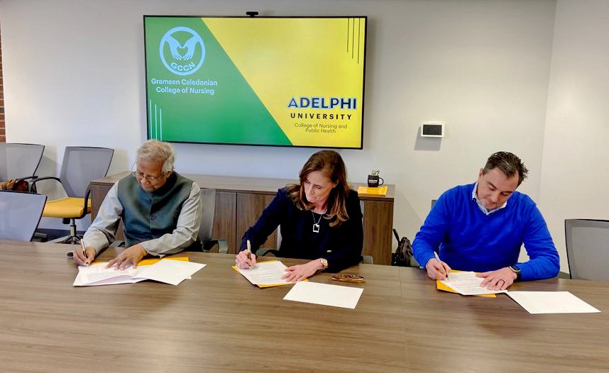 During Professor Yunus' visit, the President of Adelphi University Christine M. Riordan and Professor Yunus' on behalf of Grameen Caledonian College of Nursing (GCCN) signed an MOU to establish a formal collaboration aimed at promoting positive change within their respective communities. In January, a team led by Dr Deborah Hunt, Dean of Nursing School and Dr Ani Jacob of Adelphi University visited Bangladesh to study GCCN nursing college's activities and operations and meet it's principal and board. Professor Yunus' visit to Adelphi University which comes as a follow up of that visit, included a tour for Professor Yunus by top university officials of the state-of-the-art nursing school and facilities of Adelphi University, reinforcing their shared goal of inspiring youth to drive societal transformation.