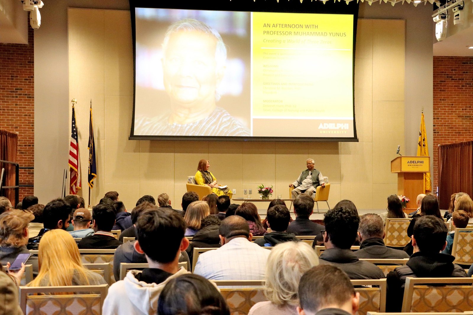 An event, titled “An Afternoon with Professor Yunus: Creating a World of Three Zeros,” took place at the Adelphi University Ballroom in Garden City, New York, in support of the Hagedorn Lectureship on Corporate Social Responsibility. The President of Adelphi University, Christine M. Riordan, and Executive Vice President Christopher K. Storm also spoke at the event, which was moderated by Deborah Hunt, dean of the university's College of Nursing and Public Health.
