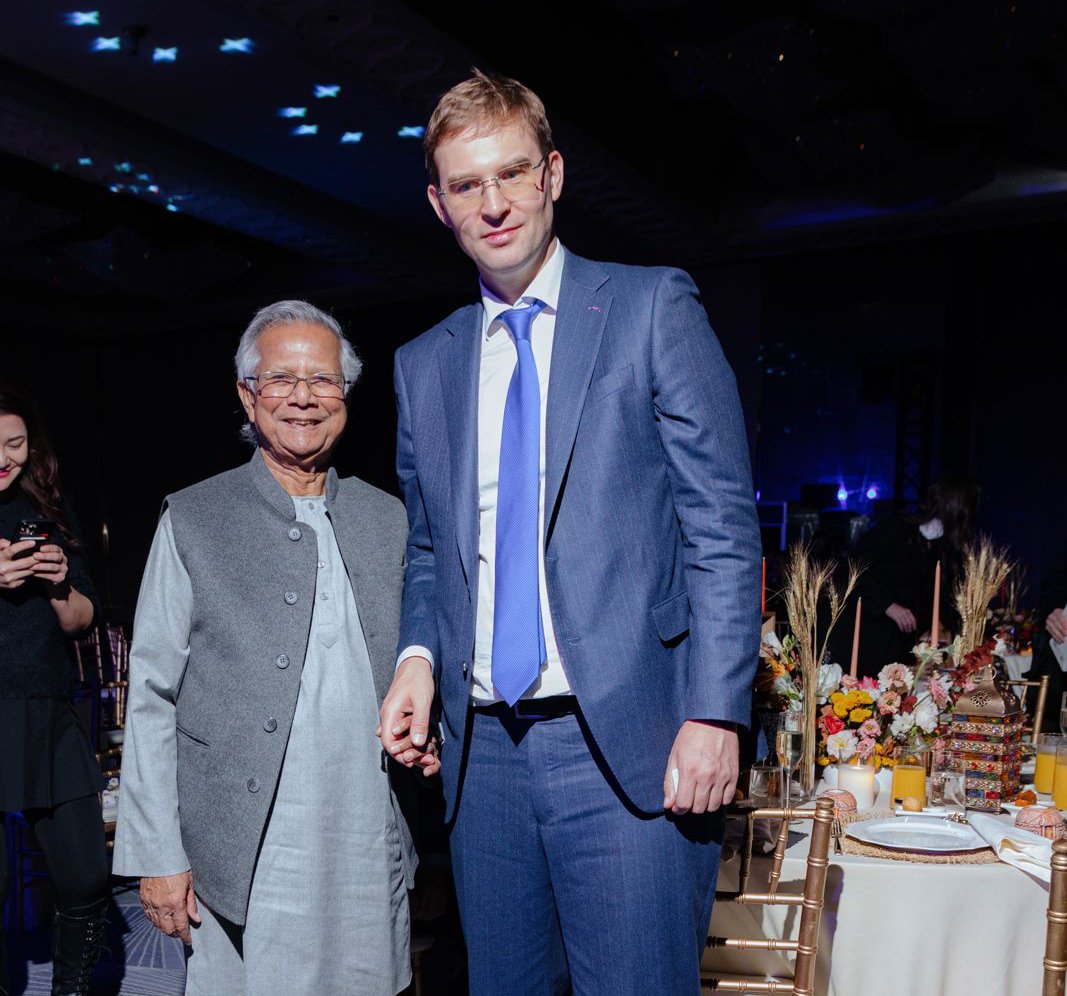 Caption for Photo 2: MrTimur Turlov, billionaire, founder and owner of the investment group Freedom Holding Corp with Professor Yunus.